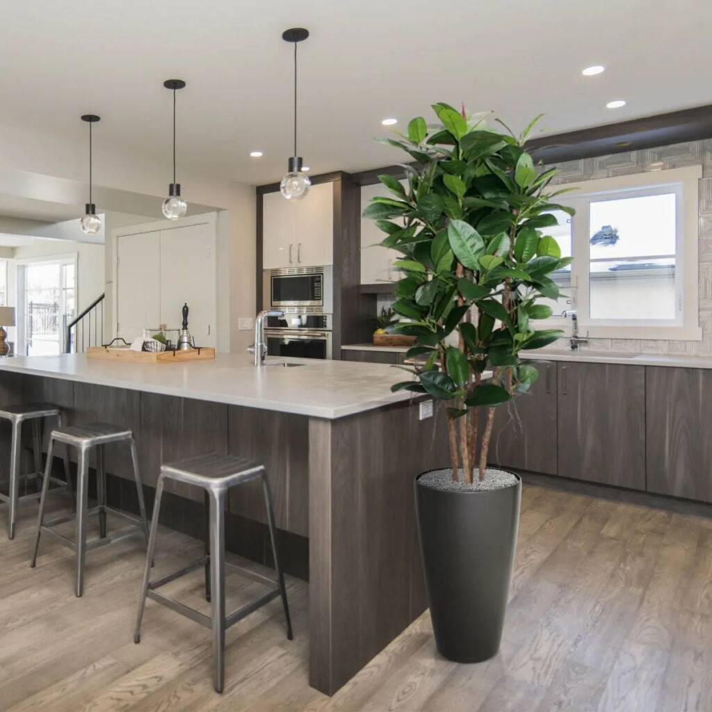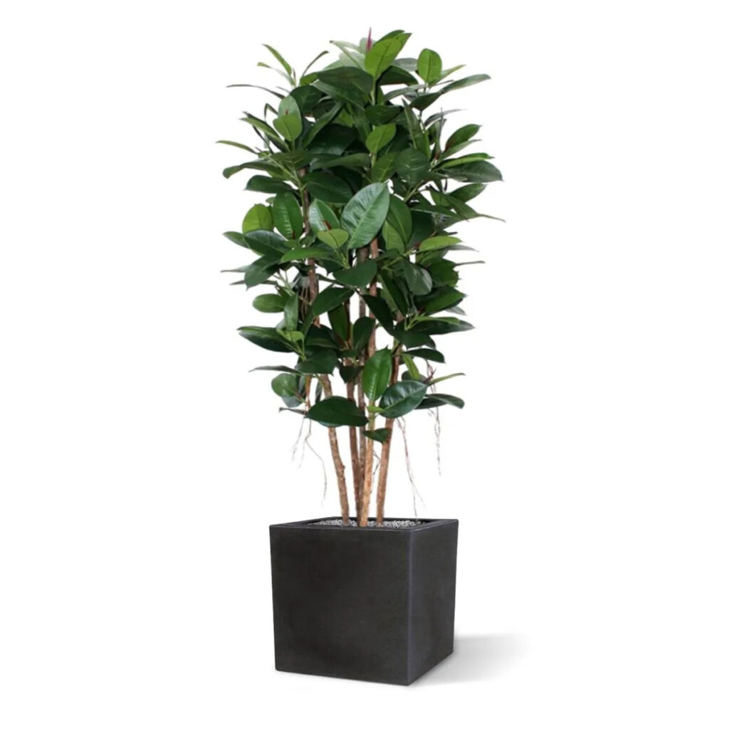 Špičková imitace fikusu s velkými listy a několika kmeny. Kmeny vyrobeny z přírodního dřeva. Standardně dodáváno ukotvené v plastovém květináči 17x15cm.
