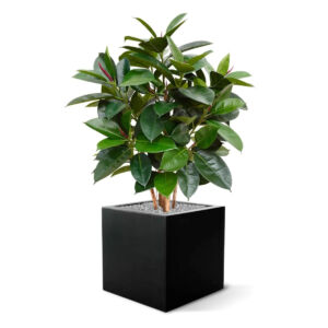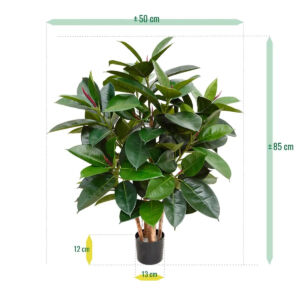 Špičková imitace fikusu s velkými listy a několika kmeny. Kmeny vyrobeny z přírodního dřeva. Standardně dodáváno ukotvené v plastovém květináči 13x12cm.