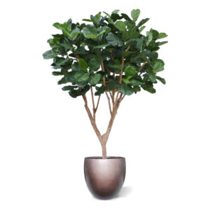 Špičková imitace fikusu s velkými listy a několika kmeny. Kmeny vyrobeny z přírodního dřeva. Standardně dodáváno ukotvené v plastovém květináči.