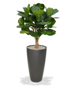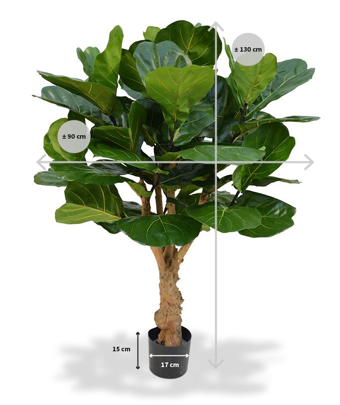 Velkolistý fikus je složen ze 70 kusů tvarovatelných listů. Celková výška je 130cm. Šířka koruny cca 90cm. Ukotveno v plastovém květináči 17x15cm.