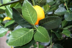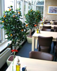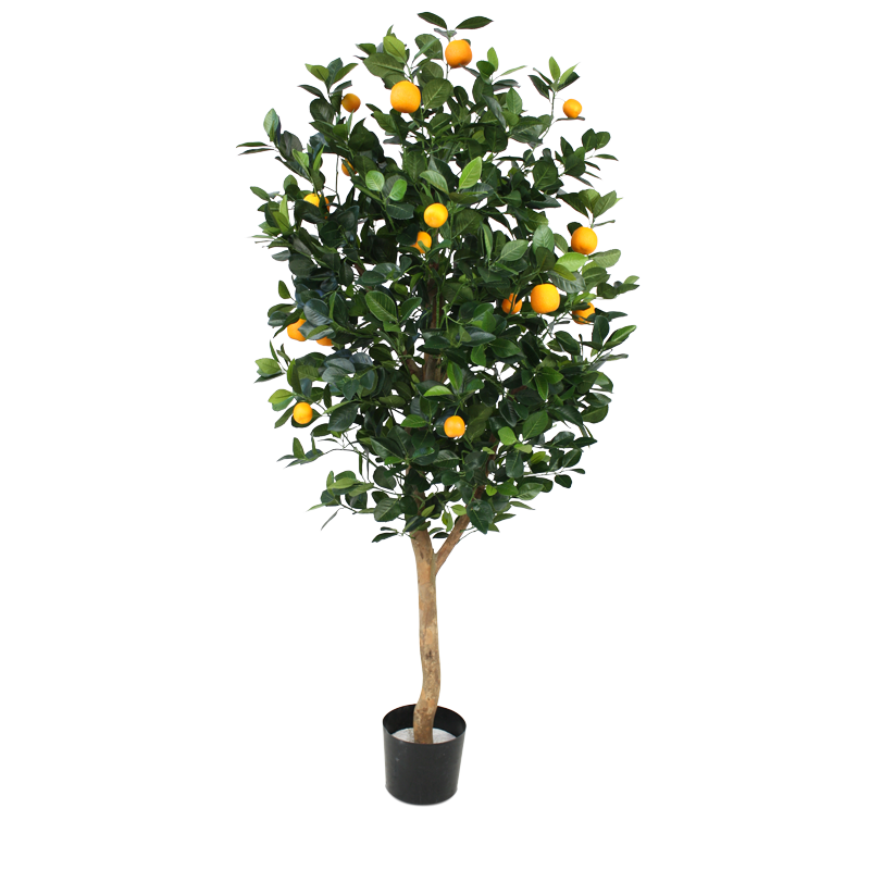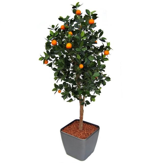 Imitace pomerančovníku s plody na přírodním kmeni. Výška cca 150cm, průměr koruny 70cm. Ukotveno v plastovém květináči 18x15cm.