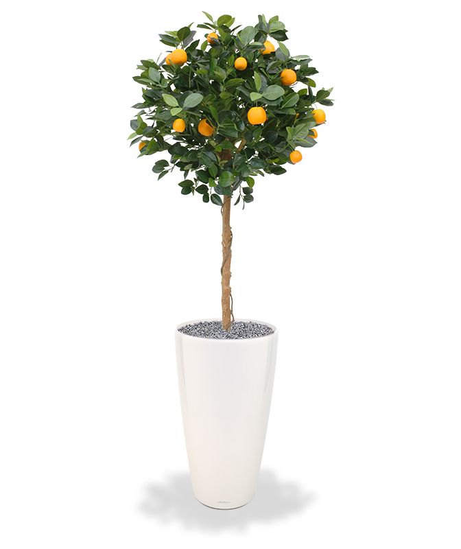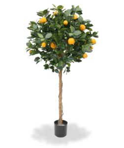 Imitace pomerančovníku s plody na přírodním kmeni. Výška cca 120 – 125cm, průměr koruny 60cm. Ukotveno v plastovém květináči 13x12cm.