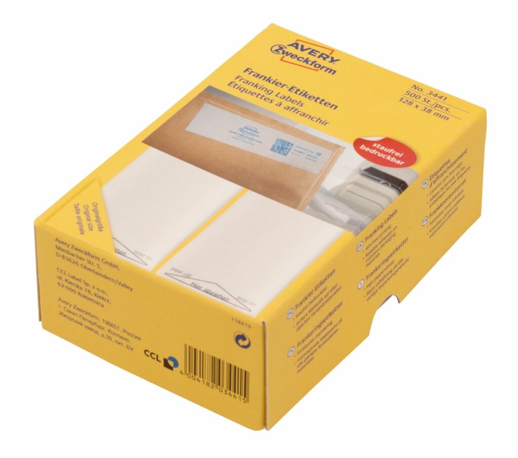 Speciální absorbční papír, ze kterého jsou univerzální etikety pro frankovací stroje Avery Zweckform 3442 vyrobeny, zajišťuje čistý a bezproblémový tisk na všech standardních frankovacích strojích.