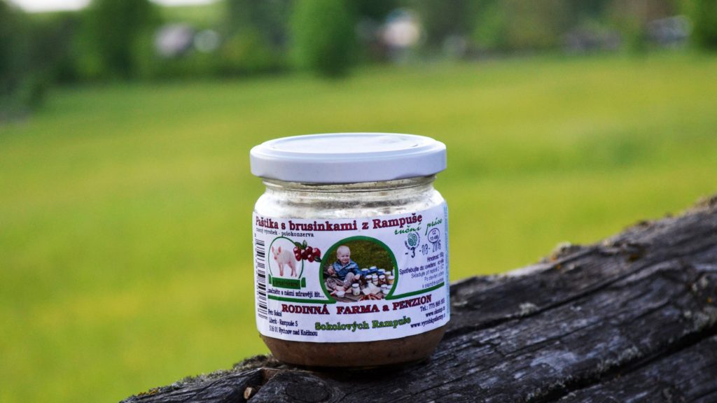 Hrubozrnně mletá paštika z vepřového masa, vepřových jater, cibule a koření, brusinek. Při výrobě používáme koření od místního dodavatele „Davídkovo koření“ – koření zcela bez konzervantů a přidané soli.