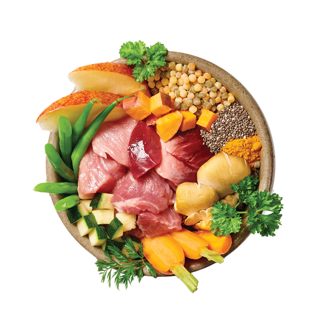 Vepřové maso (40%), vepřové srdce (15%), vepřová játra (5%), perlový kuskus (5%), sladké brambory (10%), mrkev, cuketa, fazolové lusky, jablko (5%), houby, petržel, lososový olej, olivový olej, pivovarské kvasnice, chia a kurkuma.