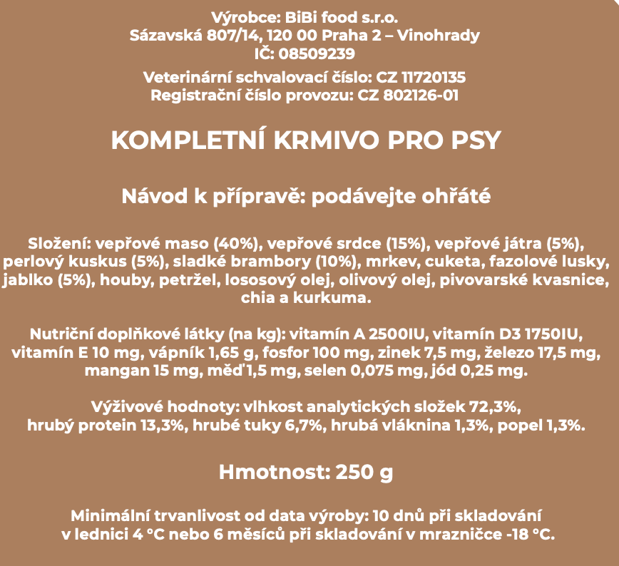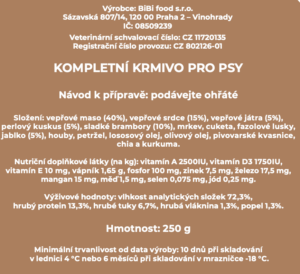 Nečekejte na sezónu a dělejte pejskovi vepřové hody celý rok. Budete váhat, jestli si jídlo pro psa vysypat na svůj talíř nebo do psí misky. Přišli jsme na to, že průmyslově zpracované jídlo nemůže nahradit to čerstvé. Na recenzi se zeptejte svého miláčka. Už skoro cítíte tu vůni? V pořádku, jsme skoro na cestě! Po Praze nás čekejte do dvou pracovních dnů, mimo hlavní město do tří.