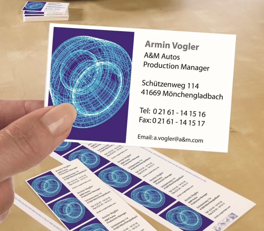 rozměr 85×54 mm, 25 archů A4, 250 ks vizitek v balení (10 ks/arch), gramáž papíru 185 g/m2, hrany s mikroperforací, barva bílá. Typ tiskárny: černobílá laserová, barevná laserová, inkoustová.