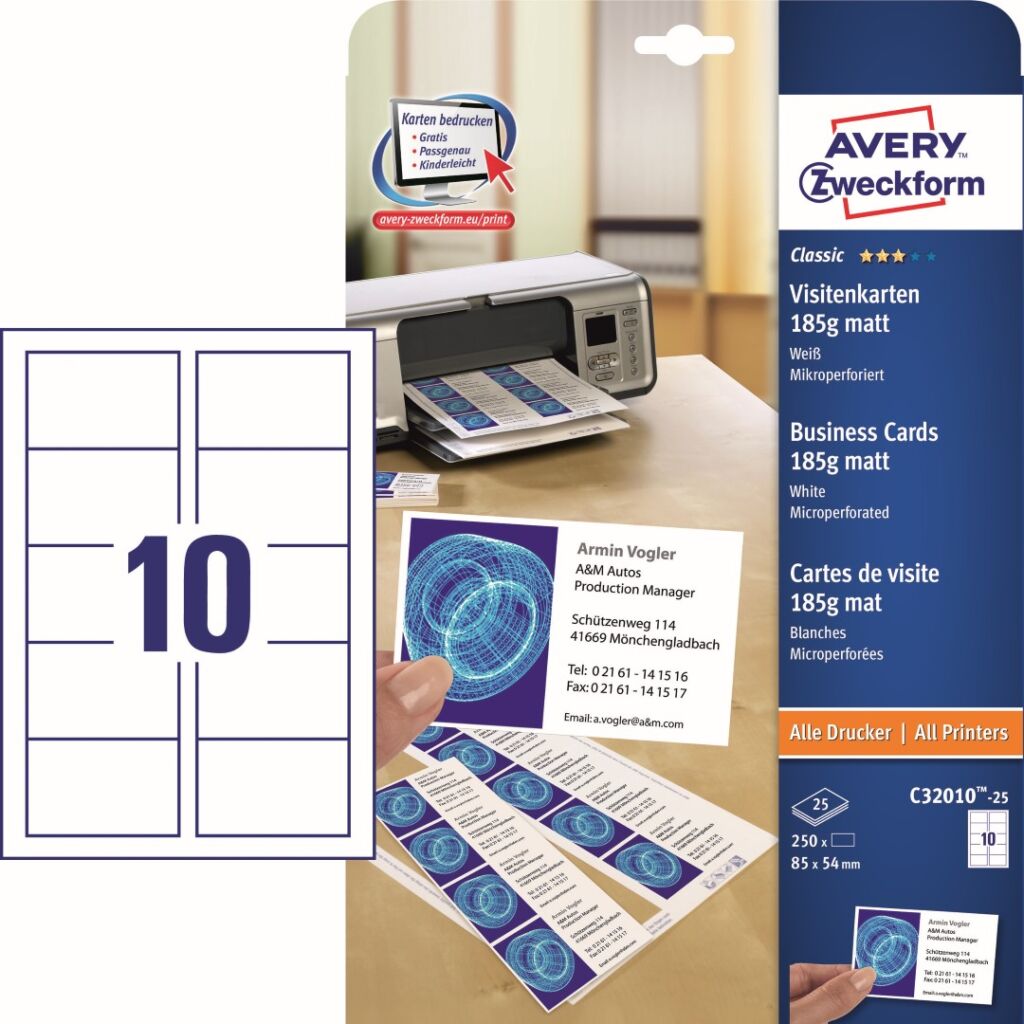 Vizitkový papír Avery Zweckform C32010-25 je ideální na malosériový tisk vizitek, pozvánek, jmenovek apod. Vytiskněte si sami vlastní vizitky jednoduše a rychle z pohodlí Vašeho domova nebo kanceláře. Aktuální vizitky tak budete mít okamžitě k dispozici, v množství, které potřebujete a navíc v profesionální tiskové kvalitě. Hrany vizitek s velmi jemnou mikroperforací, díky které od sebe jednotlivé vizitky velice snadno oddělíte. Tyto vizitky lze potisknout z obou stran, čímž vzniká více prostoru pro doplňkové informace jako například mapku s vyznačením místa Vašeho podnikání, provozní dobu, firemní slogan atd. Při tisku se můžete spolehnout na plynulý průjezd archů tiskárnou bez uvíznutí a ostrý tiskový výstup, který se díky vynikajícímu ukotvení tonerového prášku nebo inkoustu nerozmazává. Potisknutelný vizitkový karton Avery Zweckform C32010-25 je vhodný pro všechny běžné laserové i inkoustové tiskárny, kopírovací stroje a hodí se i pro psaní, resp. ruční popis.