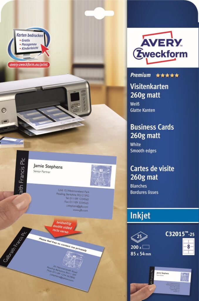 Vizitkový papír Avery Zweckform C32015-25 je ideální na malosériový tisk vizitek, pozvánek, jmenovek apod. Vytiskněte si sami vlastní vizitky jednoduše a rychle z pohodlí Vašeho domova nebo kanceláře. Aktuální vizitky tak budete mít okamžitě k dispozici, v množství, které potřebujete a navíc v profesionální tiskové kvalitě. Absolutně hladké a ostré hrany díky patentované technologii Quick&Clean™ – předsekaný karton zajistí jednoduché, rychlé a přesné vyjmutí jednotlivých vizitek z archu. Tyto vizitky lze potisknout z obou stran, čímž vzniká více prostoru pro doplňkové informace jako například mapku s vyznačením místa Vašeho podnikání, provozní dobu, firemní slogan atd. Při tisku se můžete spolehnout na plynulý průjezd archů tiskárnou bez uvíznutí a ostrý tiskový výstup, který se díky vynikajícímu ukotvení inkoustu nerozmazává. Potisknutelný vizitkový fotokarton Avery Zweckform C32015-25 je vhodný pro všechny běžné inkoustové tiskárny.