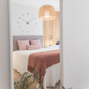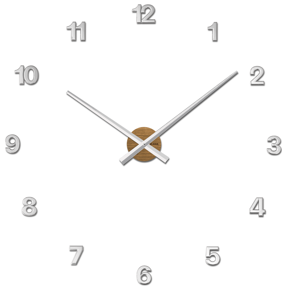 Design hodin obohacuje dubový střed napuštěný přírodním lněným olejem a díky přiložené šabloně je jednoduše nalepíte na stěnu v průměru 80 cm.