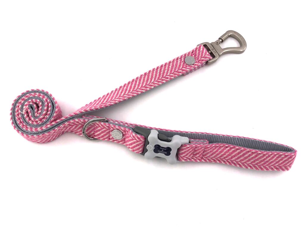 Tvídové vodítko je vyrobeno z omyvatelného tvídového materiálu a má pohodlnou rukojeť Hugo & Hudson, kterou je možné připevnit kolem nohy stolu. D kroužek pro připevnění pytlíků na exkrementy.  Je testován na 147 kg.   Vodítko má vysoce kvalitní nerezovou sponou na háčku s otočením o 360 stupňů.