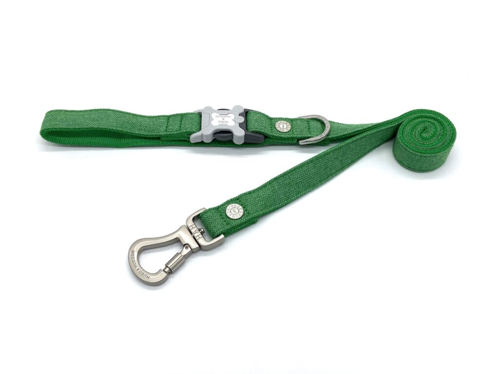 Tvídové vodítko je vyrobeno z omyvatelného tvídového materiálu a má pohodlnou rukojeť Hugo & Hudson, kterou je možné připevnit kolem nohy stolu. D kroužek pro připevnění pytlíků na exkrementy.  Je testován na 147 kg.   Vodítko má vysoce kvalitní nerezovou sponou na háčku s otočením o 360 stupňů.