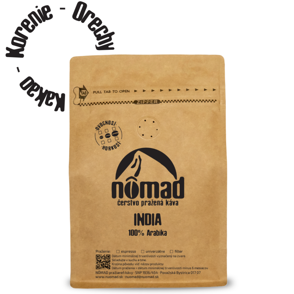 Čerstvo pražená káva - India. Káva sa vyznačuje jemnou, mäkkou chuťou s korenistým podtónom.