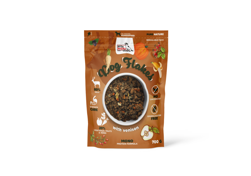 Syta Micha Dog Flakes je ideální náhrada za čerstvé krmivo na cestách i na dovolených, kde nemáte možnost objednat si u nás nebo přemístit dostatečný počet krabiček. Hypoalergenní psí krmivo s zvěřinovým masem a surovinami kategorie superfood je speciálně navržené tak, aby napodobilo krmení čerstvou stravou, a zároveň poskytovalo pohodlí granulí.