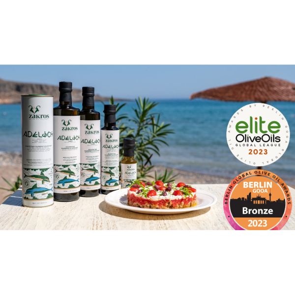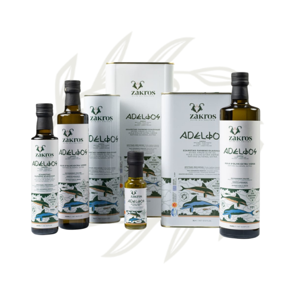 Adelfos Olive Oil – prémiový extra panenský olivový olej s PDO Lasithi, oceněný na mezinárodních soutěžích.