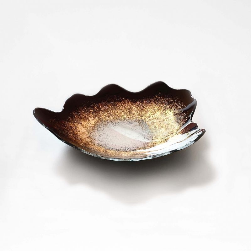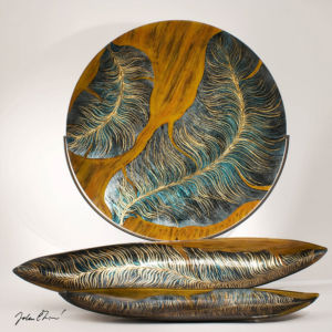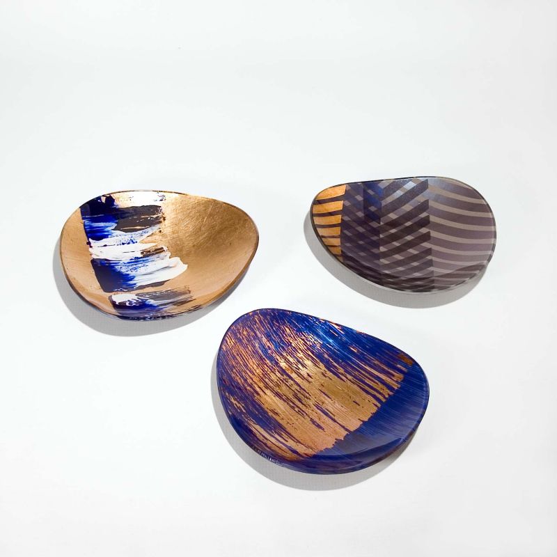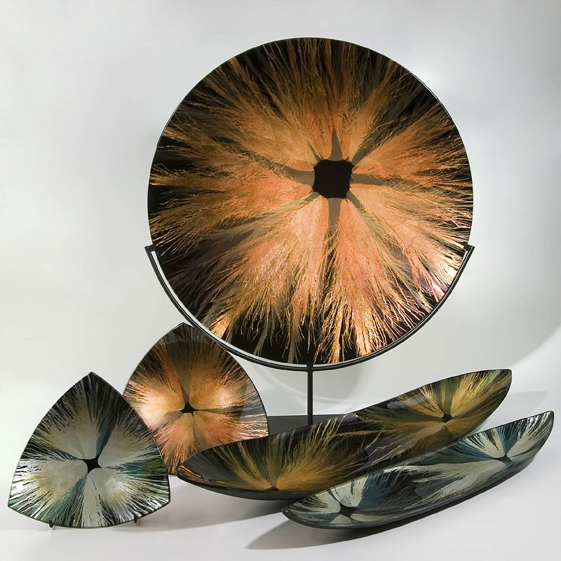 V naší kolekci uměleckých skleněných interiérových doplňků najdete výrobky, které vznikají od návrhů přes výrobu až po konečné úpravy u nás v dílně. Skleněné tabule nařežeme do patřičného tvaru, zabrousíme, vložíme do vlastnoručně zhotovených keramických forem a za vysoké teploty necháme prohnout do patřičného tvaru. Jde o technologii tzv. lehaného skla. Následně se takto vytvarované mísy, talíře, vázy, nástěnné dekorace a další předměty ručně malují.