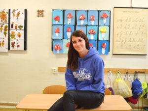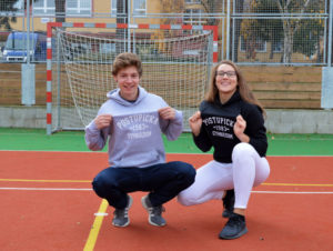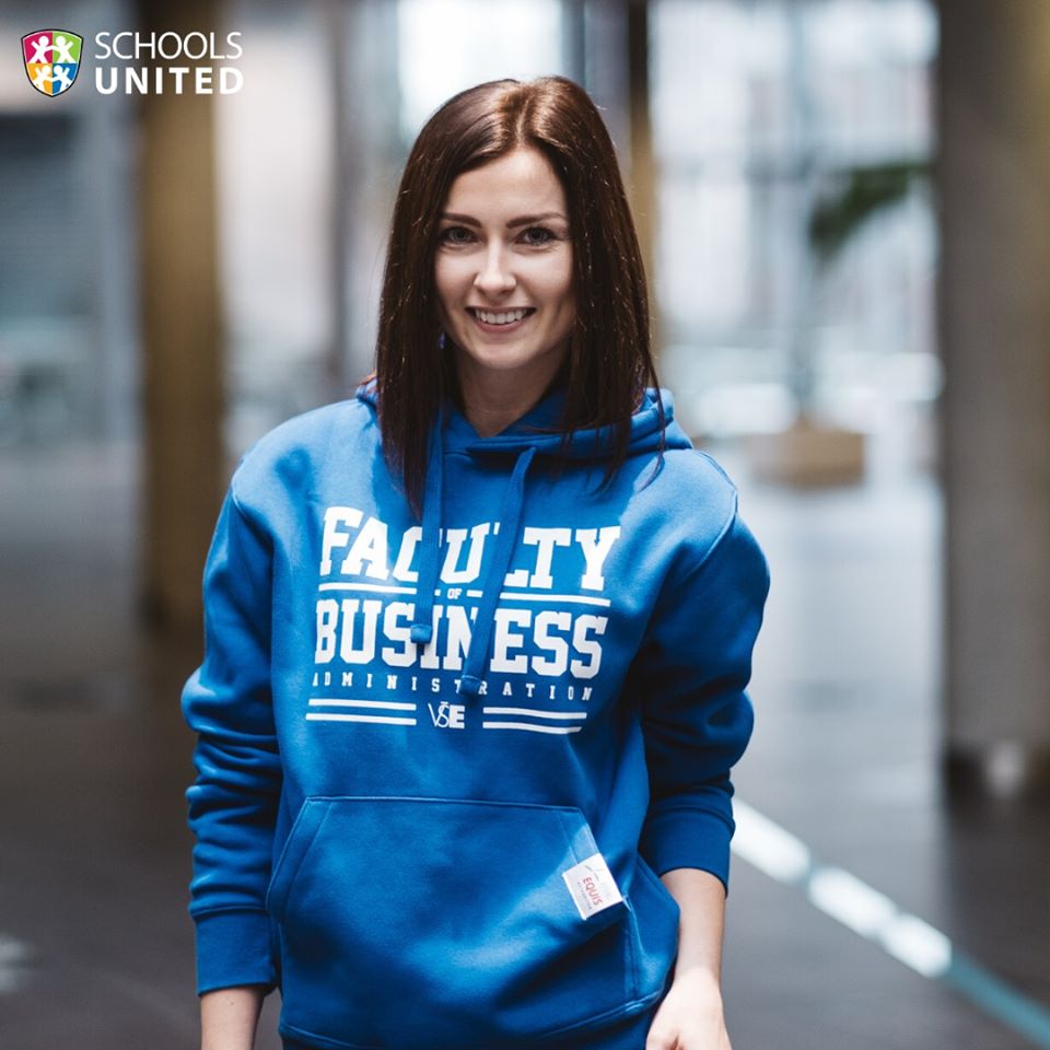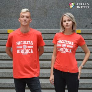 Prodej mikin, triček, kalhot a doplňků s logem školy.